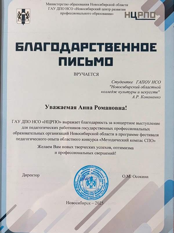 Студентам за яркое выступление - благодарственные письма. Также организаторы поблагодарили за их подготовку преподавателя колледжа культуры Светлану Александровну Некрасову. Пожелали творческих успехов, оптимизма и профессиональных свершений!