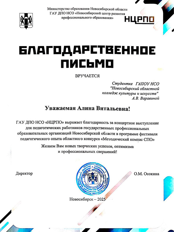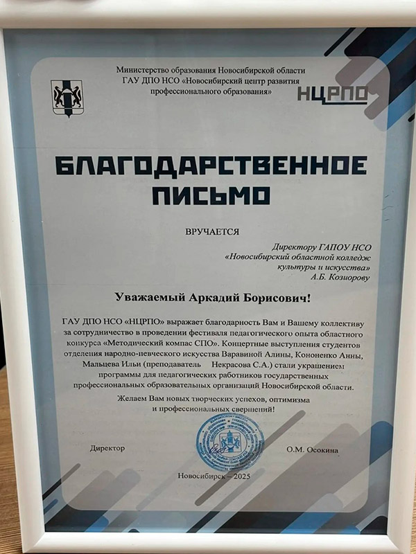 Также в благодарственном письме на имя директора НОККиИ Аркадия Борисовича Козиорова организаторы поблагодарили коллектив колледжа за сотрудничество, отметив, что выступление студентов было украшением программы!