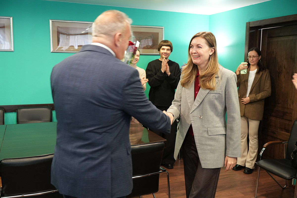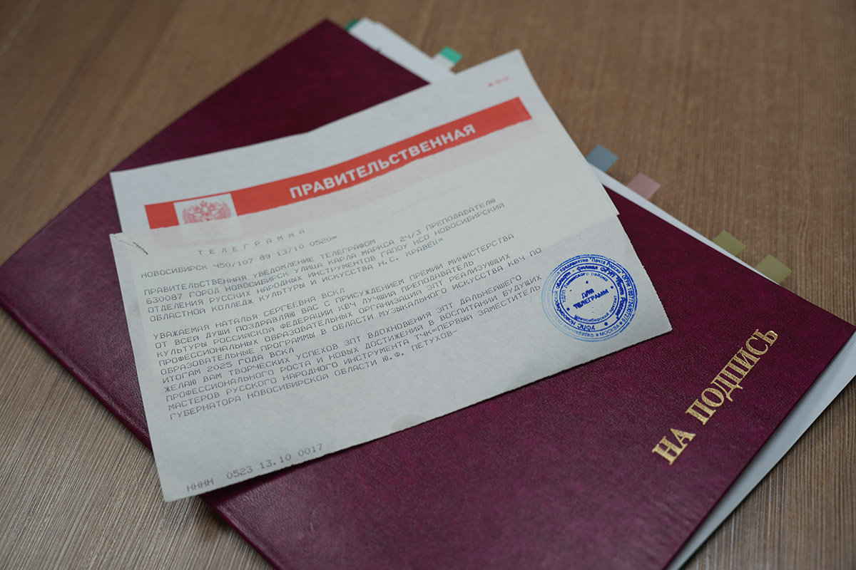 Первый заместитель губернатора Юрий Фёдорович Петухов поздравил преподавателя отделения русских народных инструментов Наталью Сергеевну Кравец с присуждением премии Министерства культуры РФ "Лучший преподаватель профессиональных образовательных организаций, реализующих образовательные программы в области музыкального искусства по итогам 2025 года":