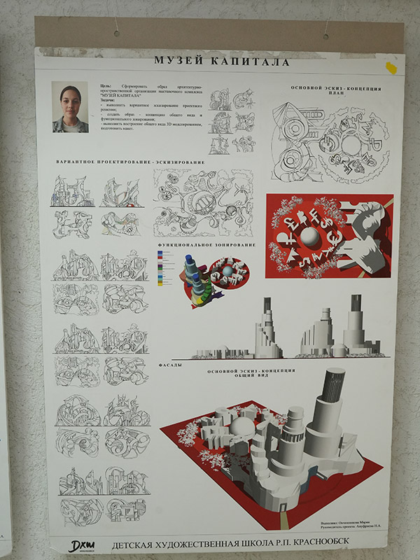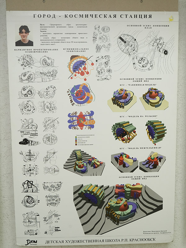 Искусство, сшитое из лоскутков! И не только. Здесь и живопись, и графика, и удивительные дизайнерские проекты: от футуристических, например, город - космическая станция, до готовых к воплощению уже сегодня, такие как проект детской площадки "Зелёный остров" и проект благоустройства парка отдыха "Обской".