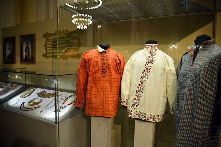 В экспозиции представлены подлинные костюмы из фондов Российского этнографического музея: мужская и женская одежда, а также отдельные элементы - рубахи, сарафаны, верхняя одежда и обувь, бытовавшие в различных губерниях России в XIX - начале ХХ столетия.