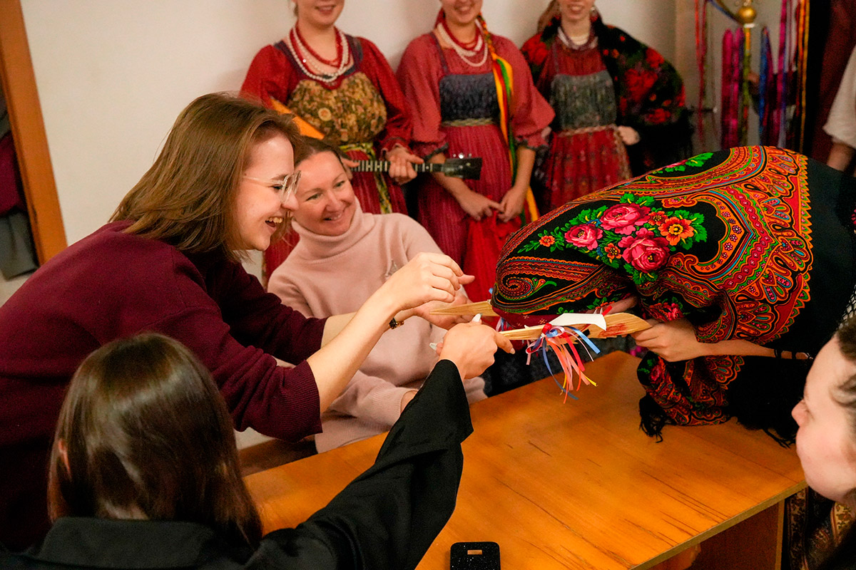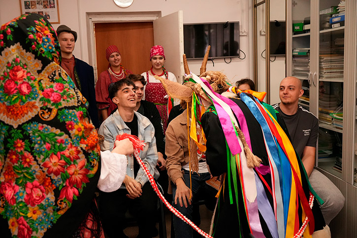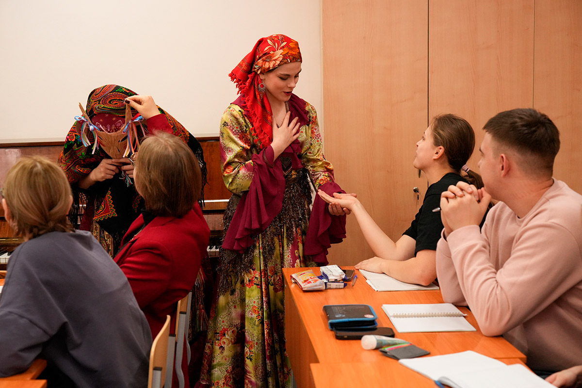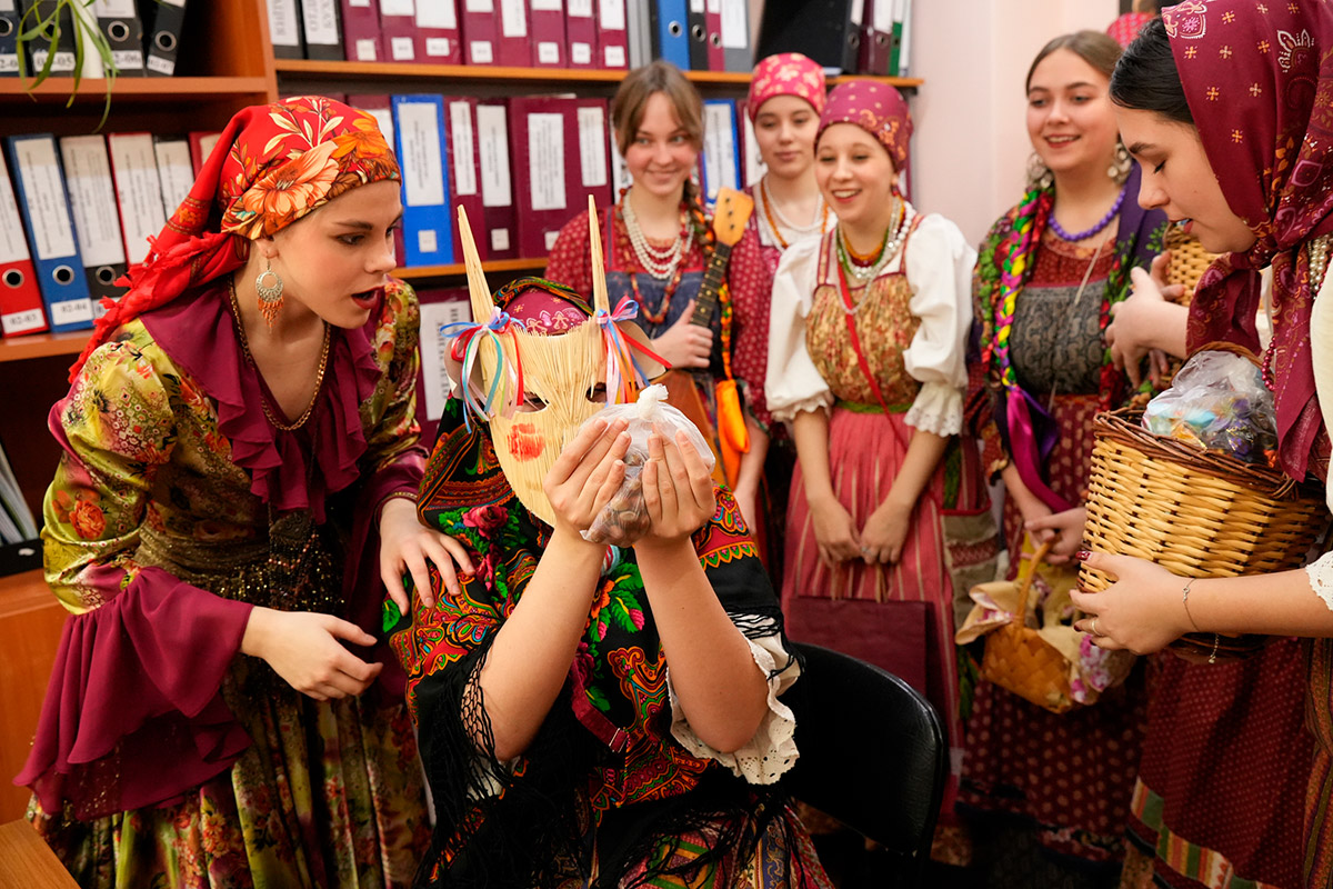 На Крещение, в последний день Святок, студенты фольклорно-этнографического отделения ходят с колядками по всему колледжу. Вот и в этот раз не пропустили ни одного этажа, заглянули в аудитории и кабинеты, чтобы спеть колядки, пожелать добра и удачи всем, кто здесь учится и работает.