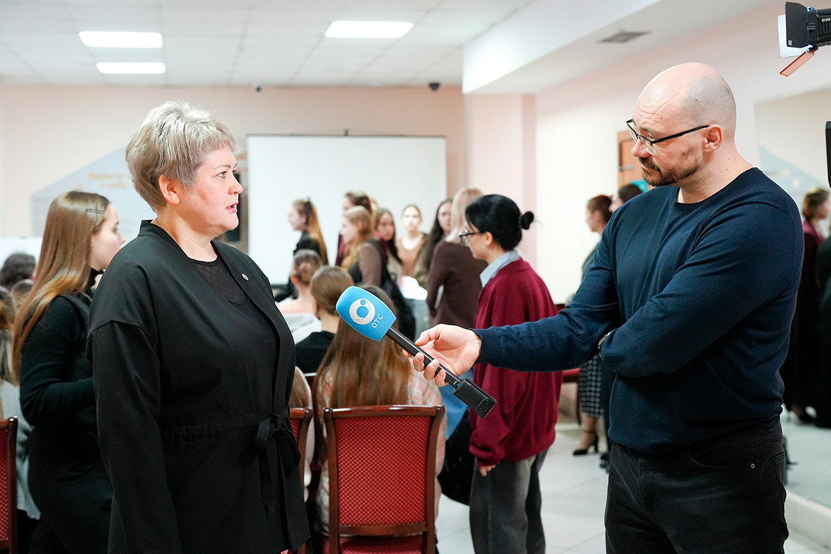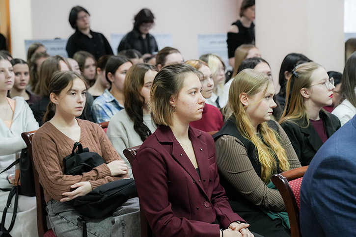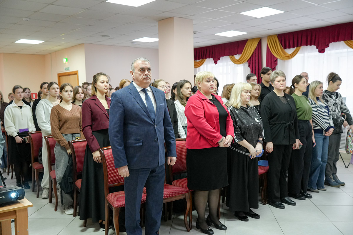Руководитель областного Центра патриотического воспитания Алла Александровна Данилевская рассказала студентам о глубокой связи Новосибирска с судьбой блокадного города. Например, в здании нынешнего ДК Октябрьской революции 9 июля 1942 года состоялась премьера Седьмой ("Ленинградской") симфонии Дмитрия Шостаковича в исполнении эвакуированного Ленинградского симфонического оркестра. И композитор присутствовал на этой премьере.