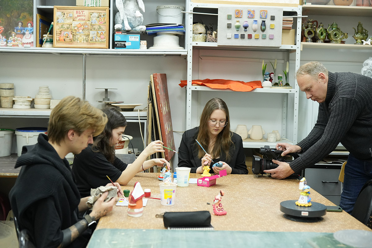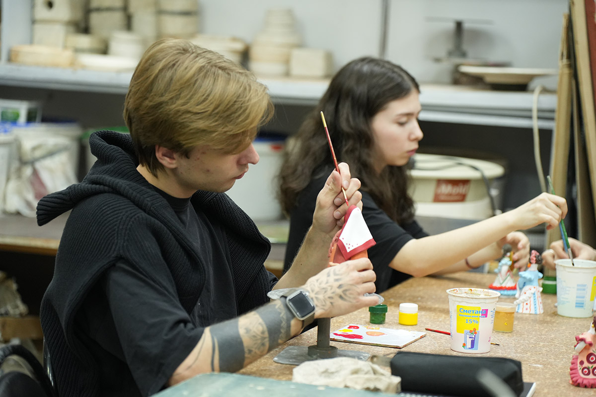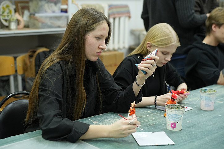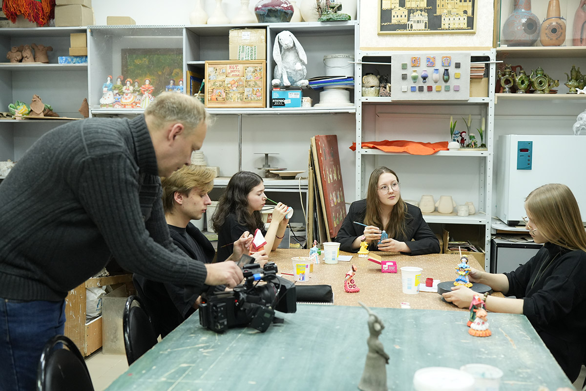 На отделении декоративно-прикладного искусства нашли новый способ диалога культур, соединив каноны знаменитого русского промысла с красотой национальных костюмов разных народов. Студенты предложили- преподаватель поддержал. Идея и её воплощение оказались настолько интересными, что на занятие по керамике к третьекурсникам даже телевидение приехало.