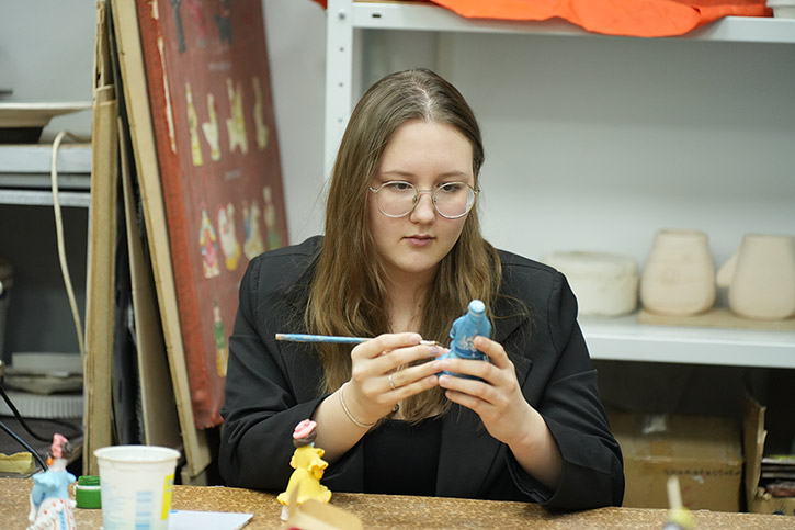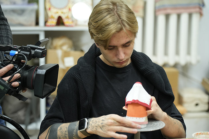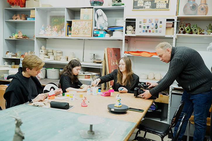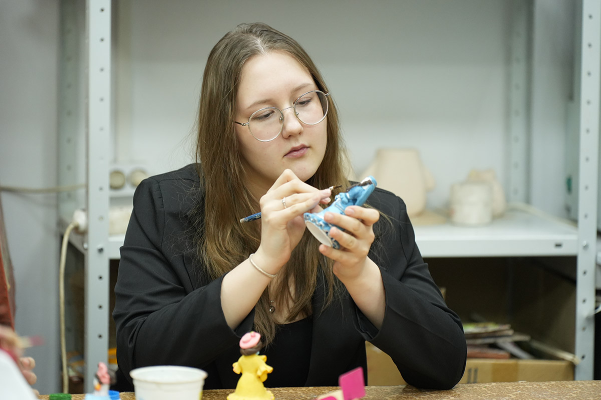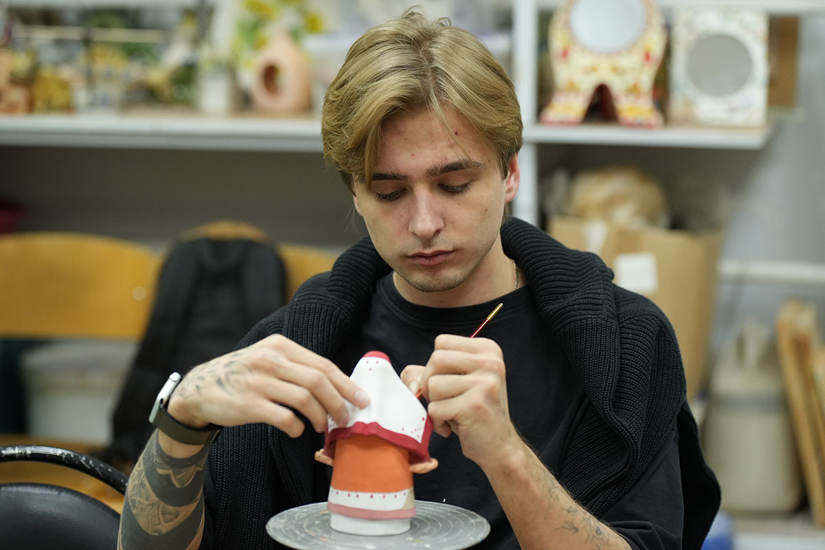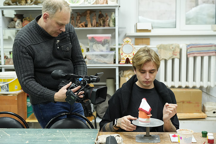 На отделении декоративно-прикладного искусства нашли новый способ диалога культур, соединив каноны знаменитого русского промысла с красотой национальных костюмов разных народов. Студенты предложили- преподаватель поддержал. Идея и её воплощение оказались настолько интересными, что на занятие по керамике к третьекурсникам даже телевидение приехало.