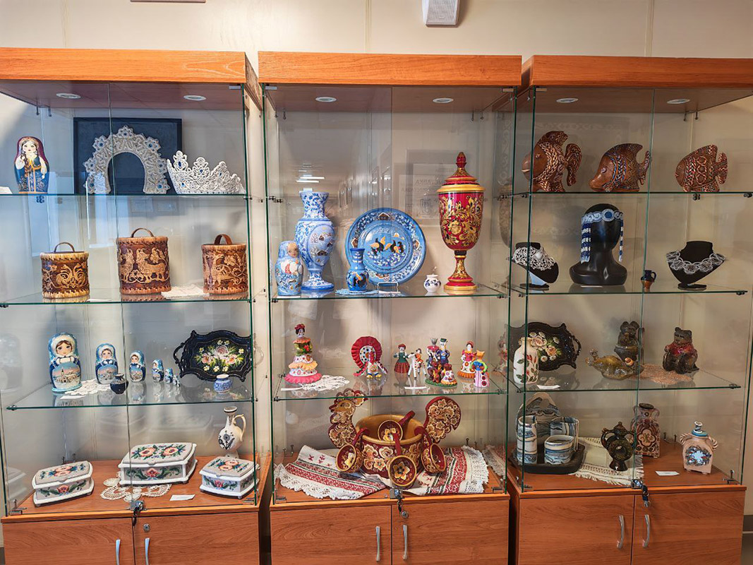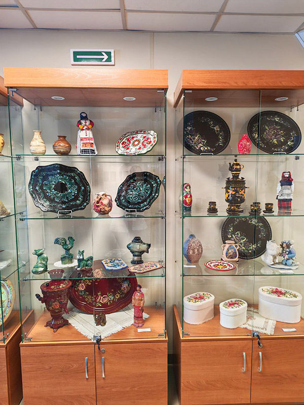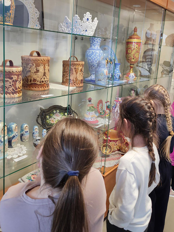 Экспозиция оказалась не только вдохновляющей, но и практически полезной. Она стала наглядным пособием для школьников, которые как раз изучают традиционные промыслы. Например, раздел с дымковской игрушкой: дети подходят к керамическим фигуркам со своими эскизами, внимательно рассматривают детали росписи, чтобы создать свою собственную работу.