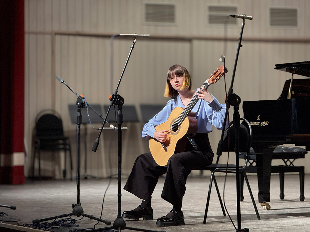 Полина Бондарева вышла на сцену со своим первым - и пока единственным, но мы уверены, что не последним - сочинением. Это пьеса для гитары "Сны о лете". Призналась, что было очень волнительно. Но, думаем, это тот самый опыт, ради которого и стоит выходить за пределы учебной аудитории: