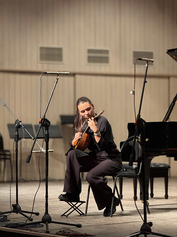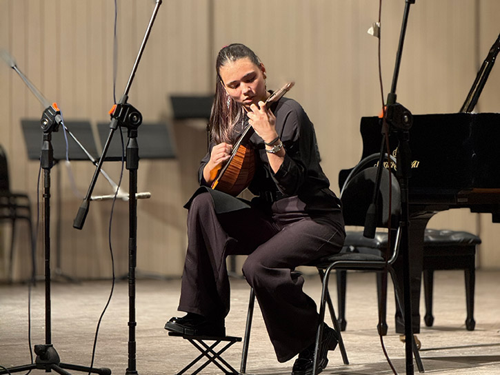 Каролина Пазик, тоже третьекурсница, представила экспромт для домры соло. Рассказала, что сочиняет с восьмого класса - начинала с песен, а потом ушла в инструментальную музыку. Говорит, играть собственное сочинение - двойная ответственность: