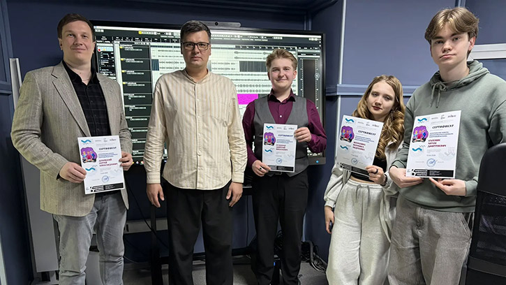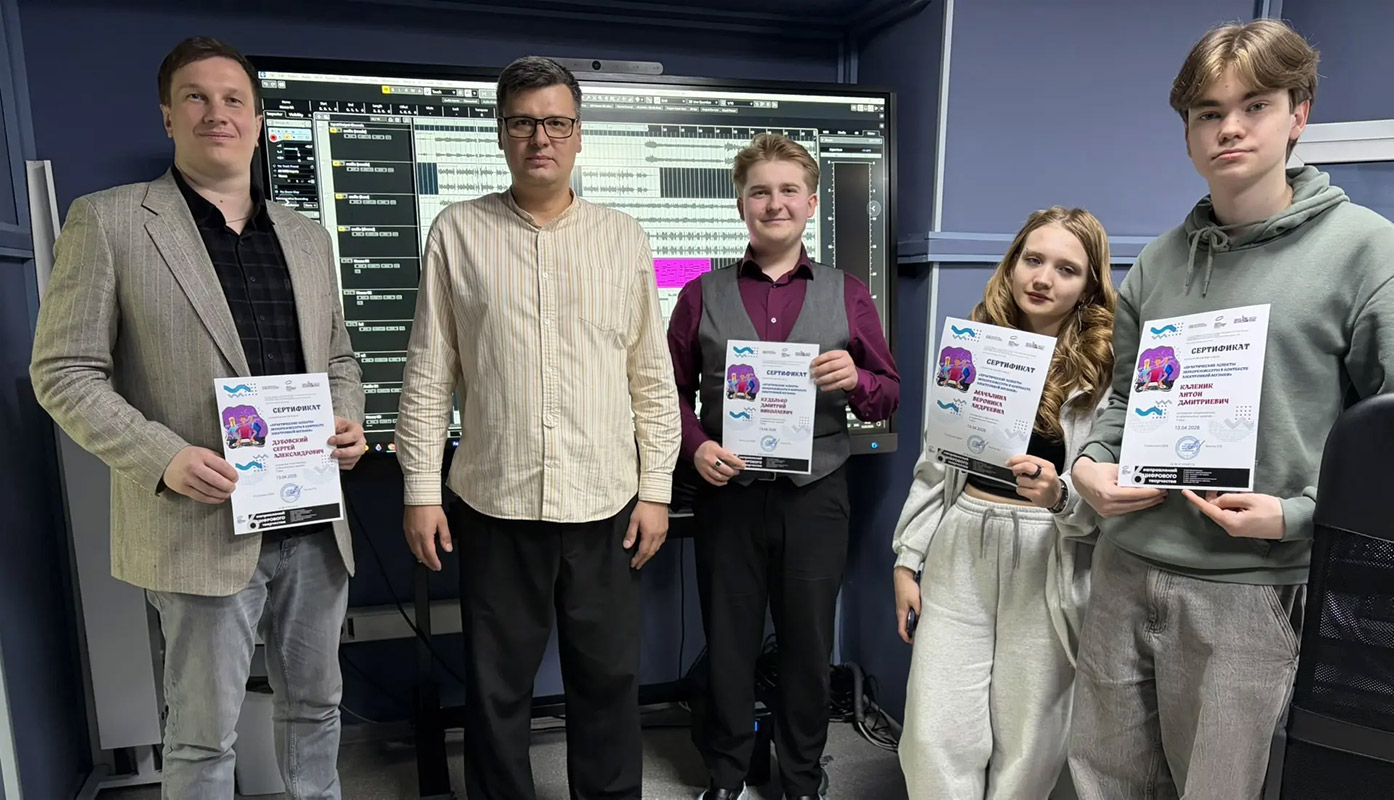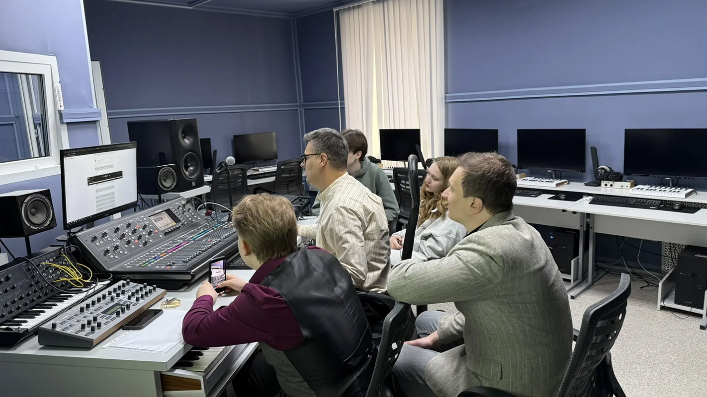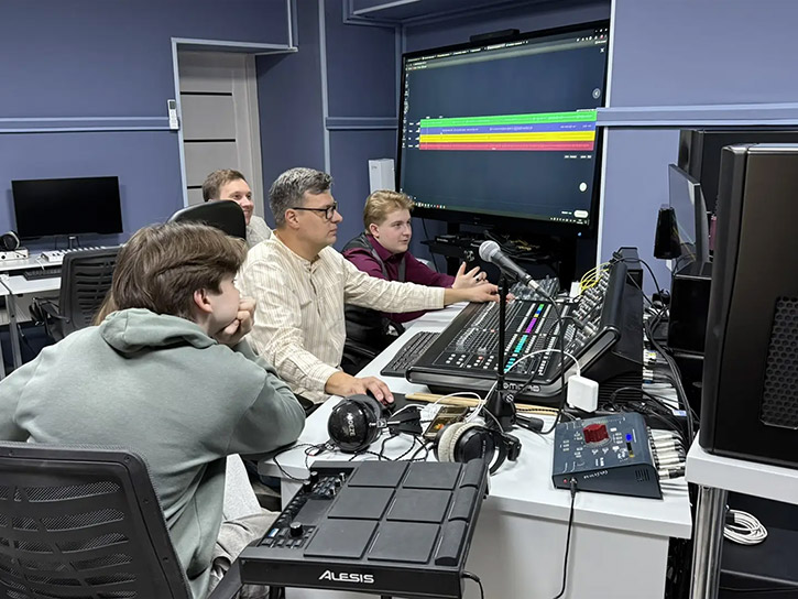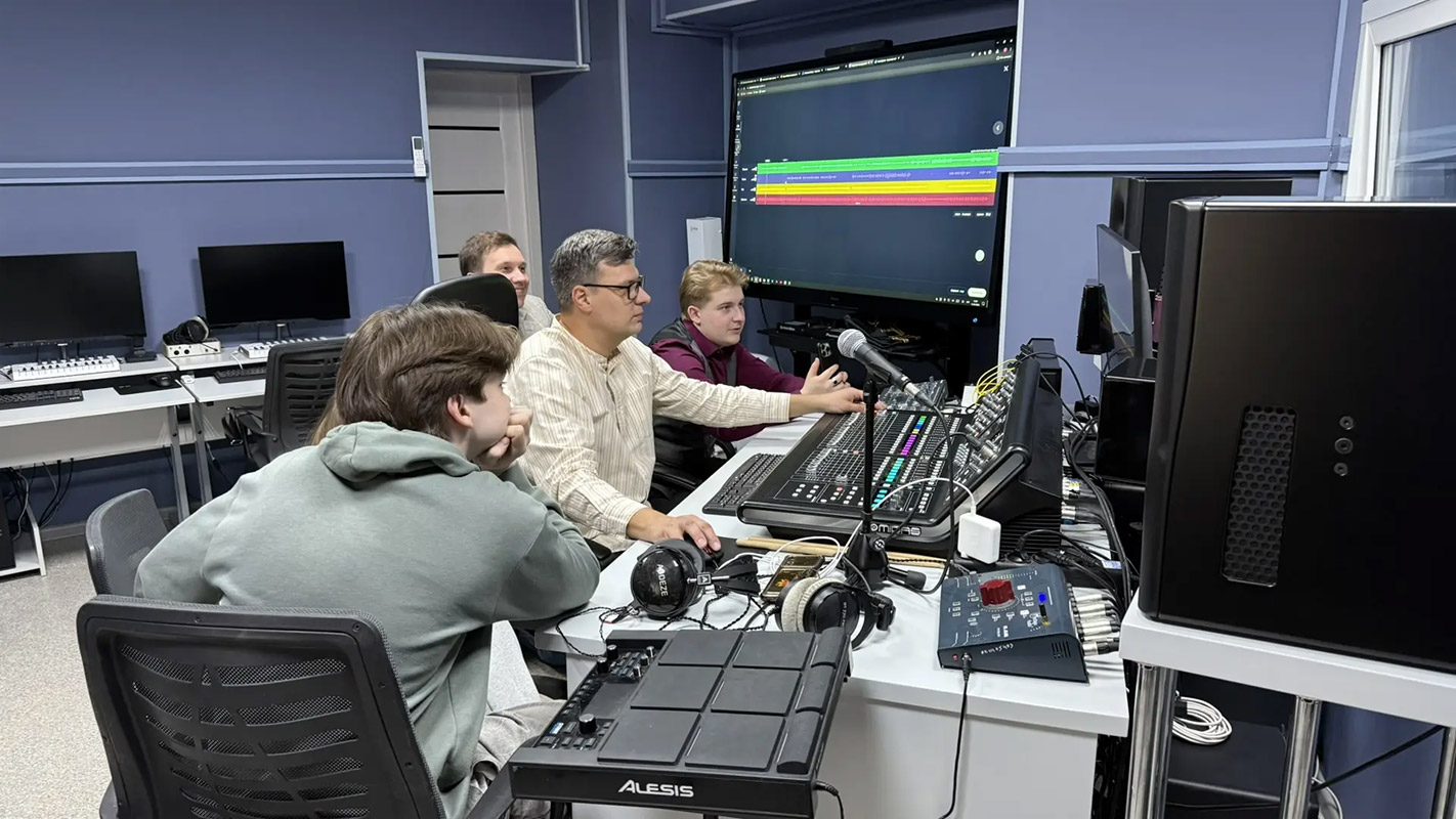 Программа пребывания насыщенная. Один из ключевых пунктов - знакомство с современными креативными технологиями. Для гостей провели экскурсию по Школе креативных индустрий НОККиИ, а педагог студии звукорежиссуры и электронной музыки Дмитрий Александрович Сидоров на мастер-классе рассказал и показал, как на практике использовать современные технологии, в том числе искусственный интеллект.