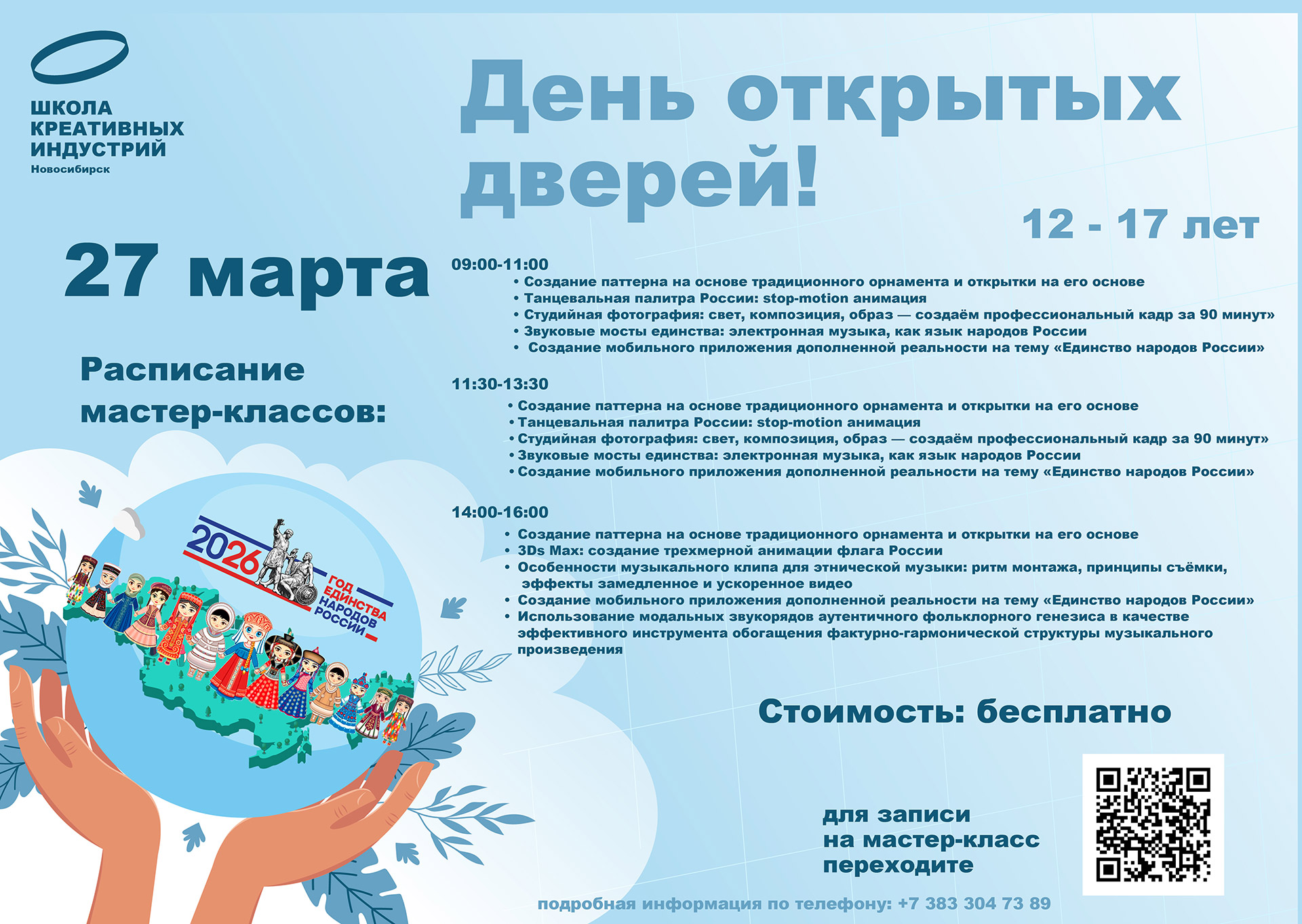 27 марта (пятница) с 09:00 до 16:00 в Школе креативных индустрий (пр-т Карла Маркса, 24/2) в рамках Дня открытых дверей, состоятся мастер-классы по шести направлениям креативных индустрий: анимация и 3D-графика, дизайн, интерактивные цифровые технологии VR и AR, фото- и видеопроизводство, современная электронная музыка.