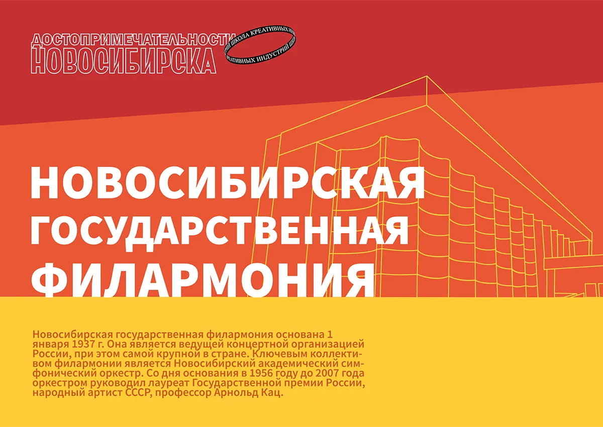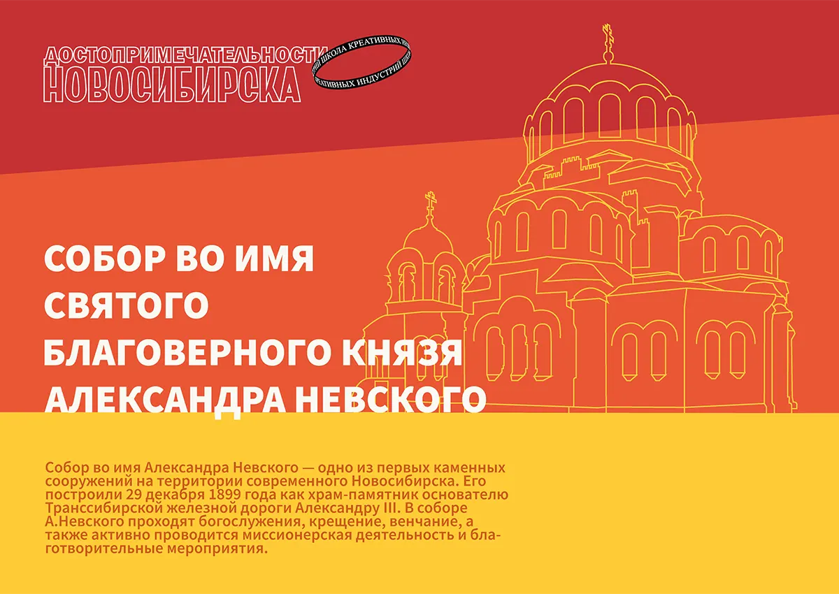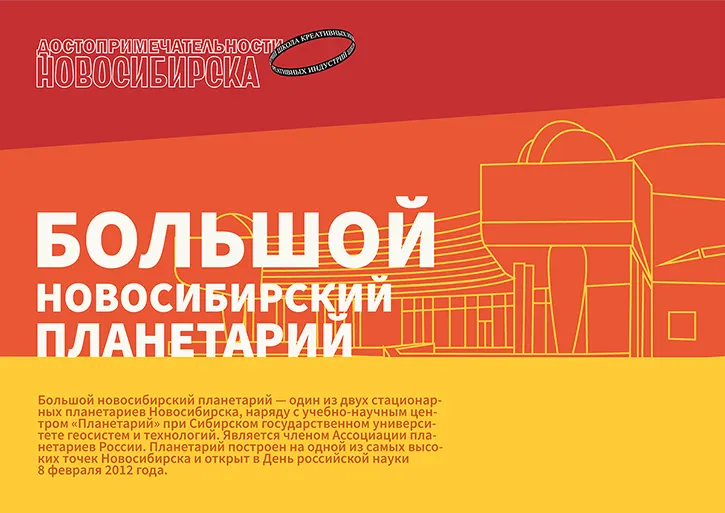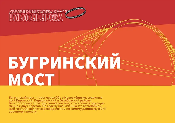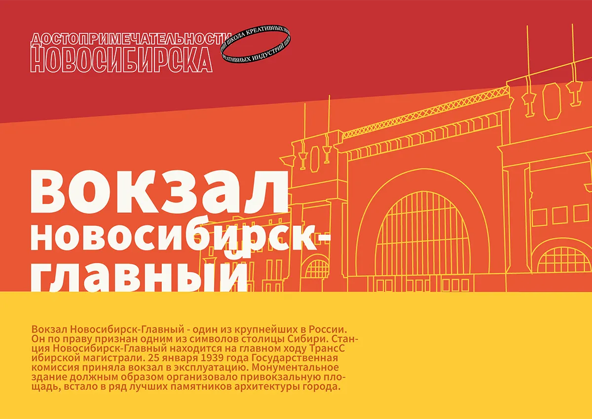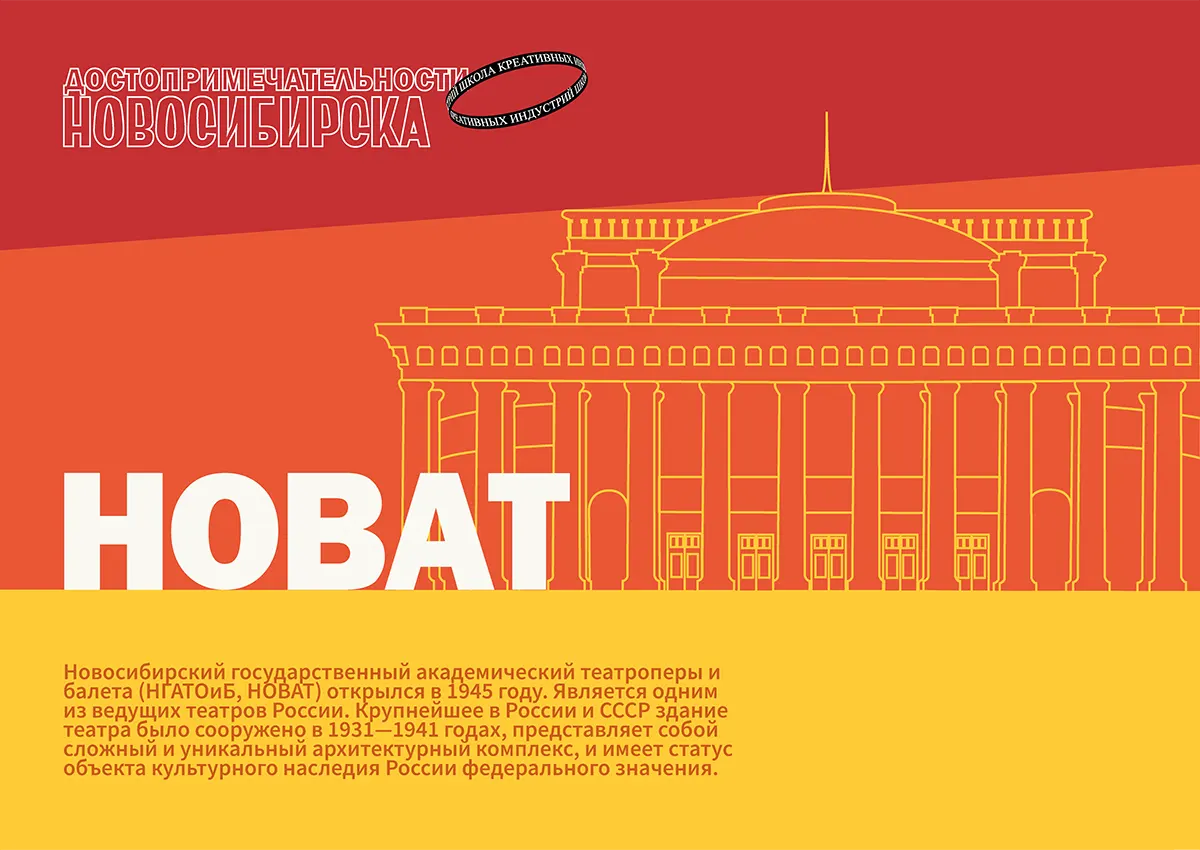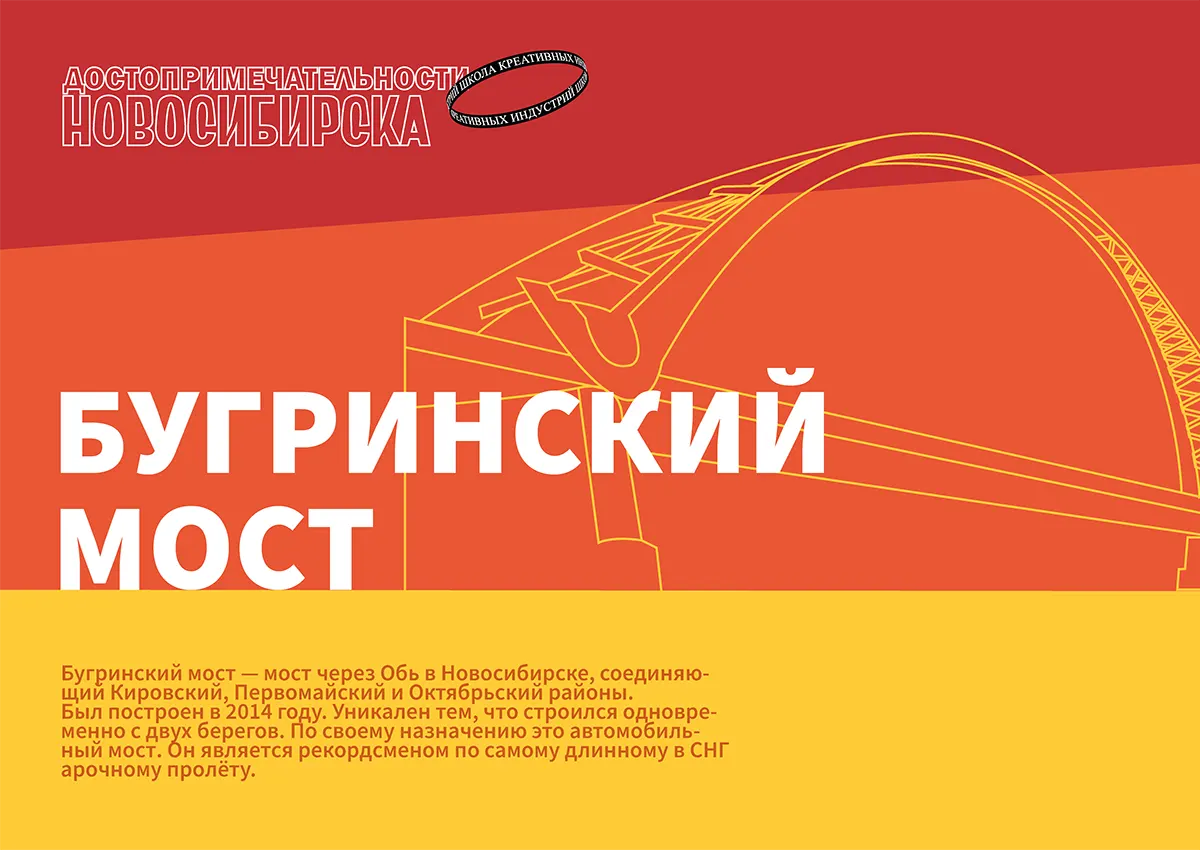 Достопримечательностям Новосибирская посвятила свой итоговый проект Дарья Заварзина. Она выбрала стильное и яркое оформление для своего проекта и подготовила целую серию познавательных плакатов, в которых можно узнать основную информацию о зданиях и примечательных местах. Для своей работы Дарья выбрала самые знаменитые места: Бугринский мост, Новосибирская государственная филармония, Вокзал Новосибирск-Главный, НОВАТ, Собор во имя Александра Невского, Большой Новосибирский планетарий. Анимацию для презентации проекта подготовил Александр Емельянов.