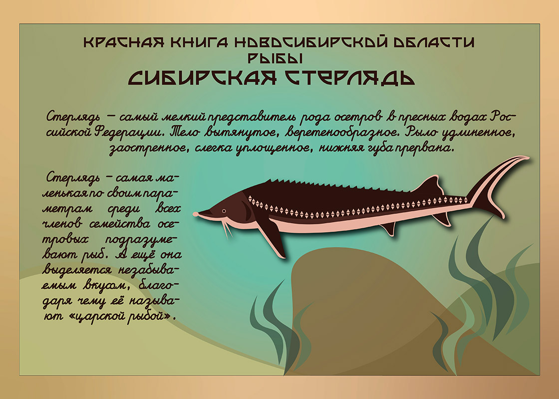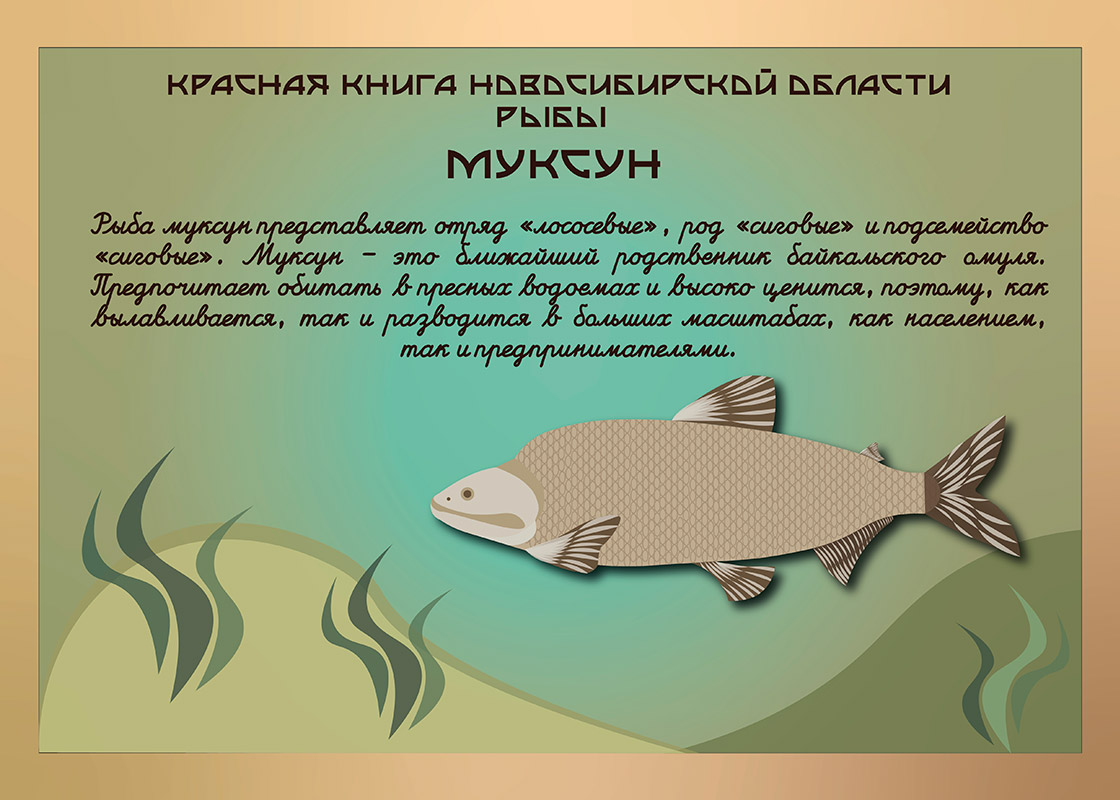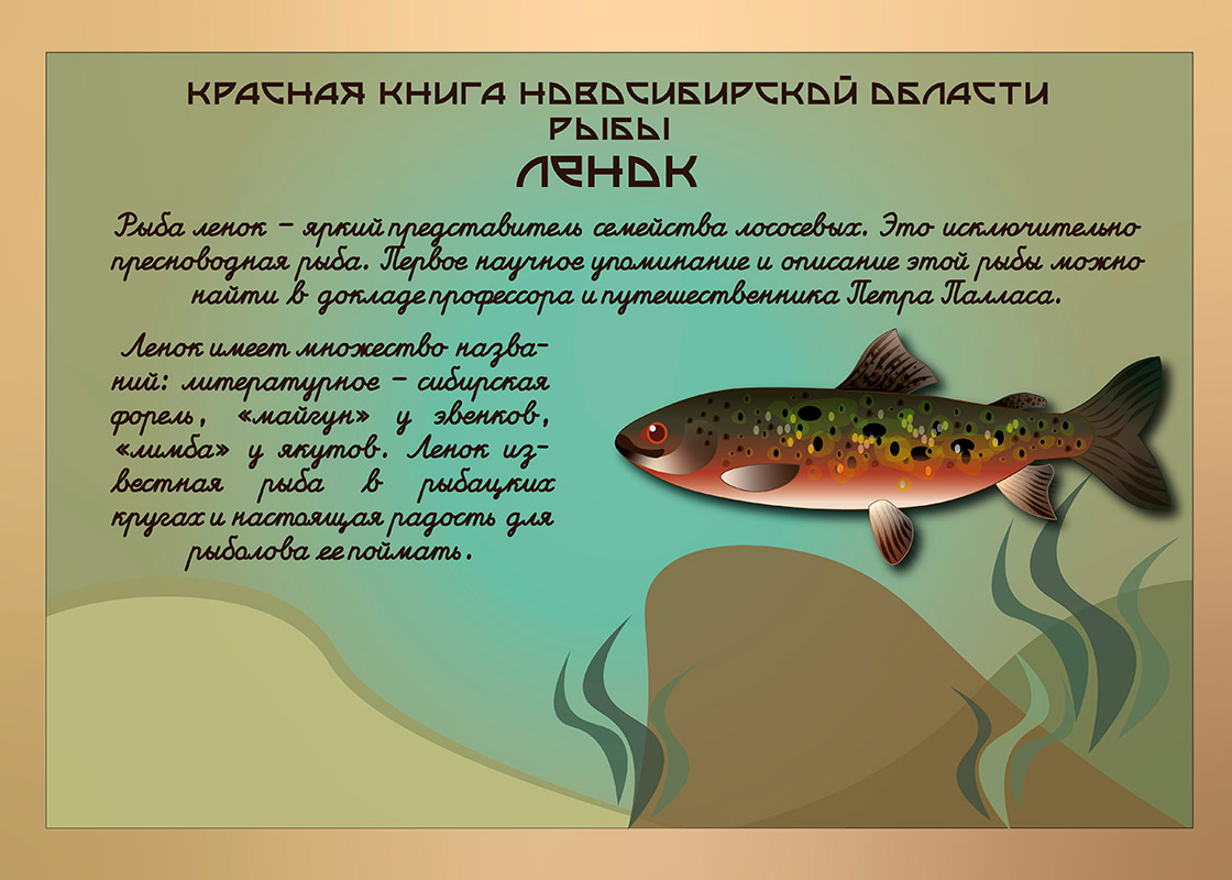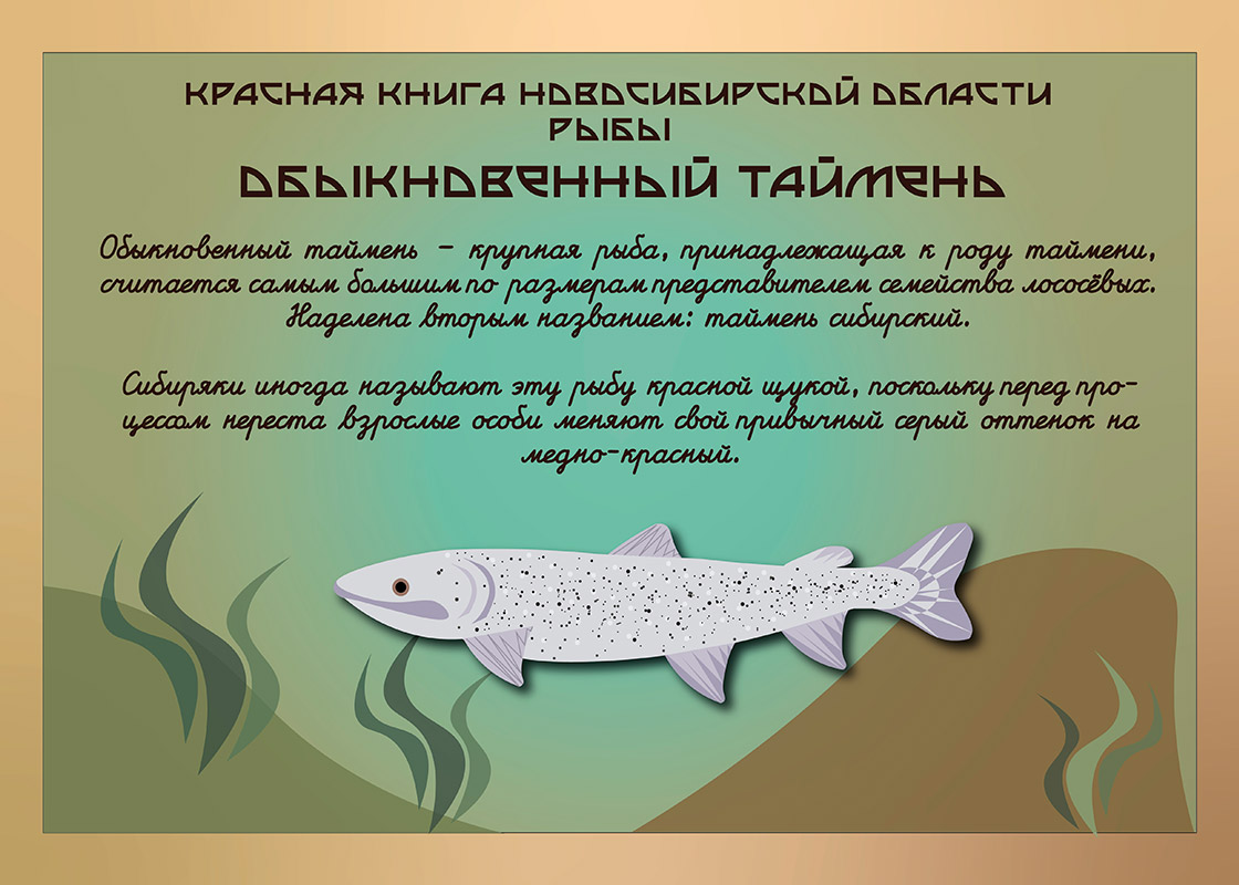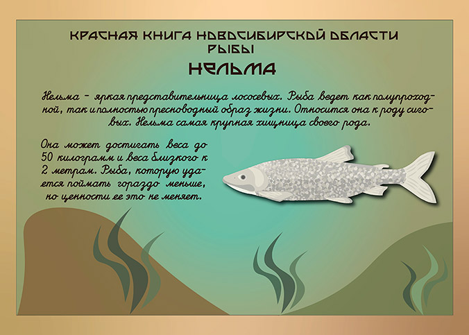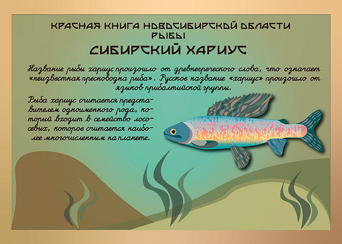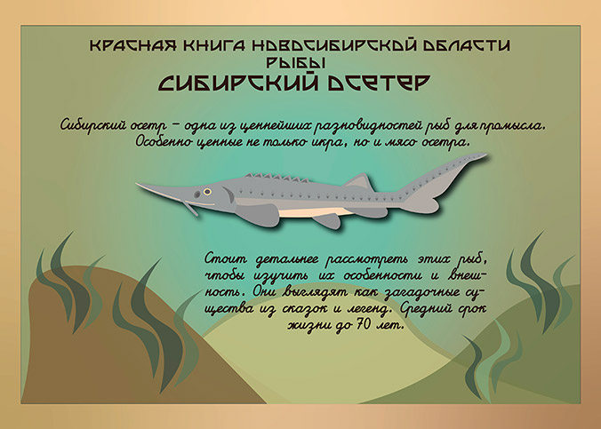 Удивительным и стильным итоговым проектом нас порадовала Таисия Швец. Она посвятила свою работу исследованию красной книги Новосибирской области, а точнее тому разделу, который собрал редких для нашей области рыб. Таисия не только отрисовала каждую рыбку, но и сделала суперстильные винтажные плакаты, которые здорово смотрятся как выставочный экспонат. В проекте были отрисованы: ленок, муксун, нельма, обыкновенный таймень, сибирская стерлядь, сибирский голец-усач.