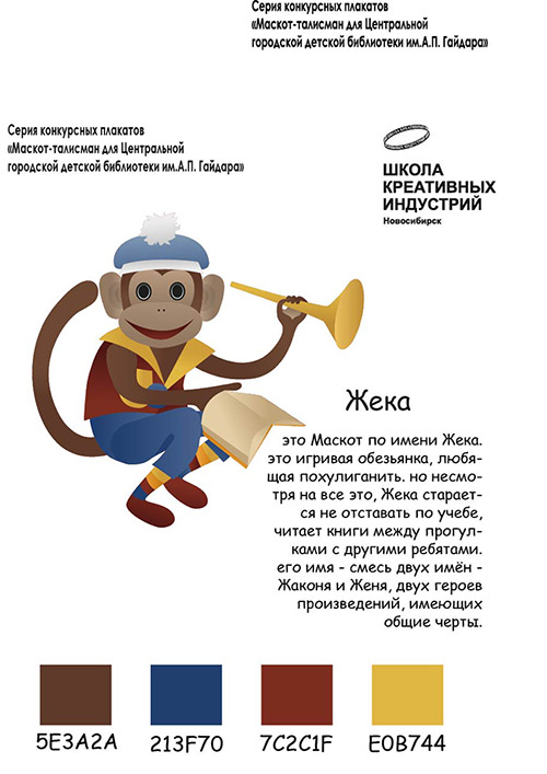 Его, как и другие работы, можно увидеть на презентационных плакатах - одностраничной версии презентаций, где были широко представлены все нюансы разработки маскота от цвета до его истории.