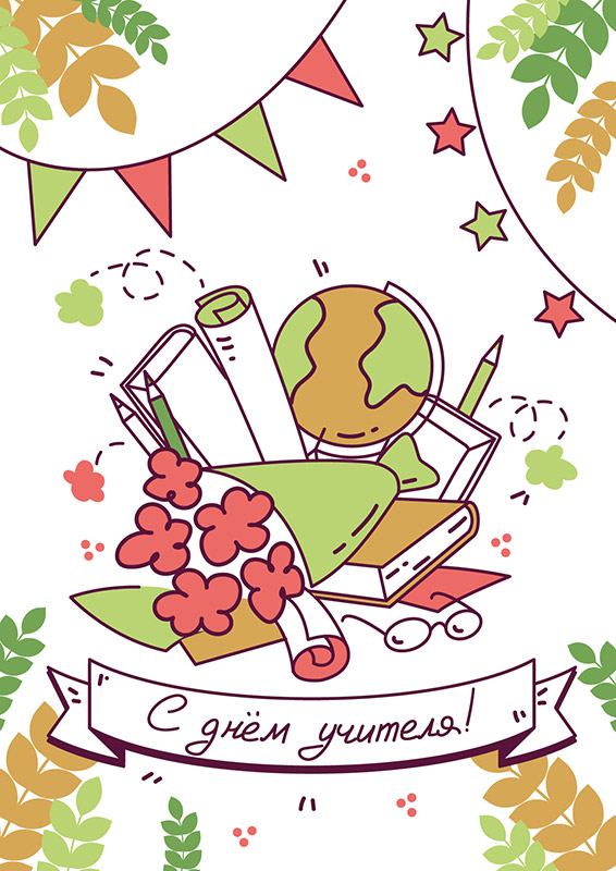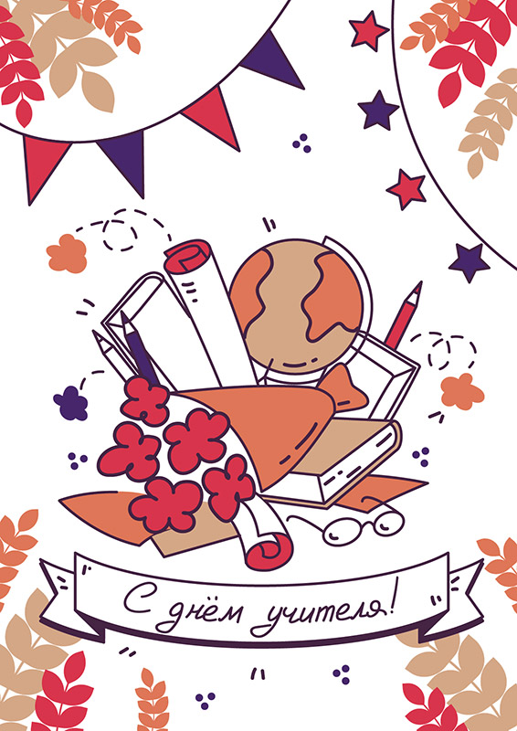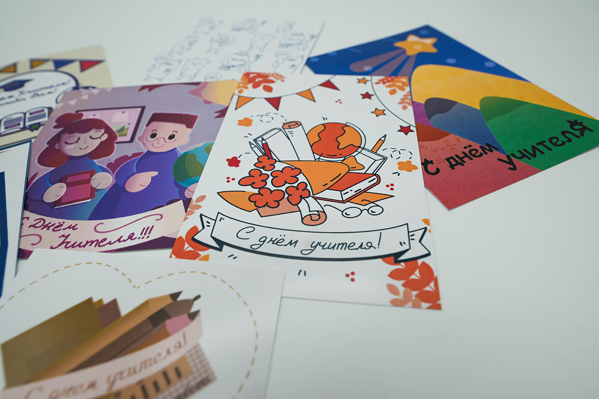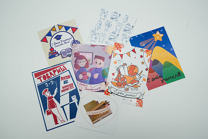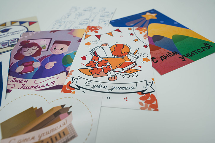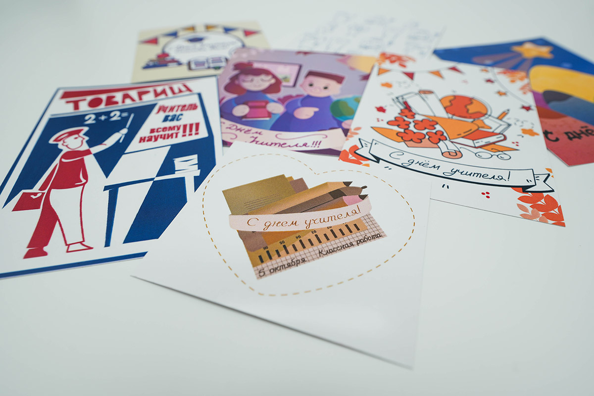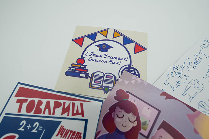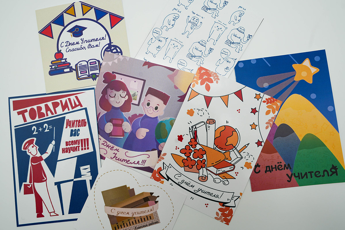 Ко дню учителя, который теперь отмечается пятого октября, ученики второго года обучения студии создали серию открыток. Они по-разному раскрыли тему учительства и вместе сделали очень разнообразные работы, исполненные в разных стилях. Поэтому в рамках этого проекта получились и лаконичные открытки в стиле мемфис, и большие иллюстративные открытки. Ими мы поздравили педагогов Школы Креативных Индустрий с праздником. Так открытки были распечатаны и вручены учениками их любимым школьным учителям.