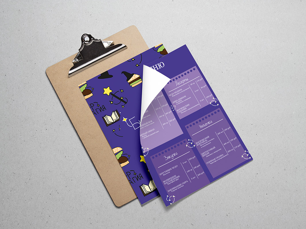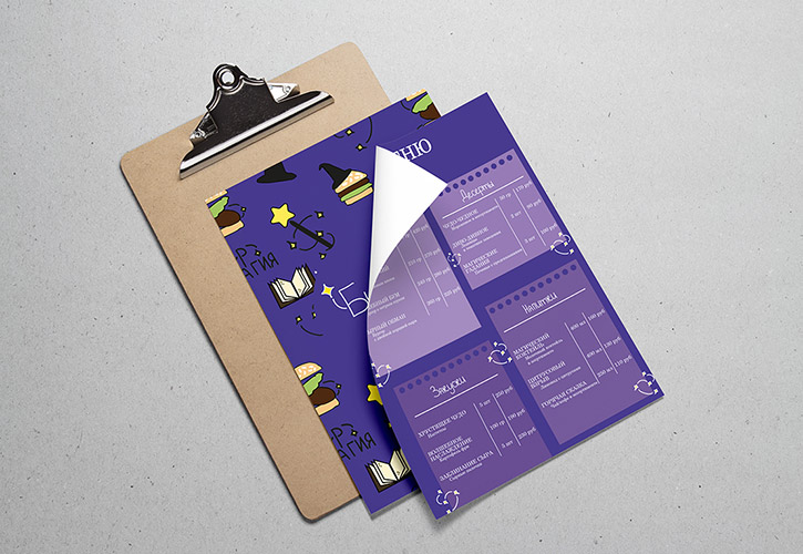 Автор проекта, Екатерина Соколова, прекрасно воплотила эту двойственную концепцию в визуальном стиле. Фиолетовый цвет в палитре символизирует тайну, интуицию и духовность, а желтый - энергию, радость и щедрость кулинарных даров. Эзотерический паттерн, украшающий пространство, добавляет глубины и интриги, намекая на мистические возможности, которые ждут гостей.