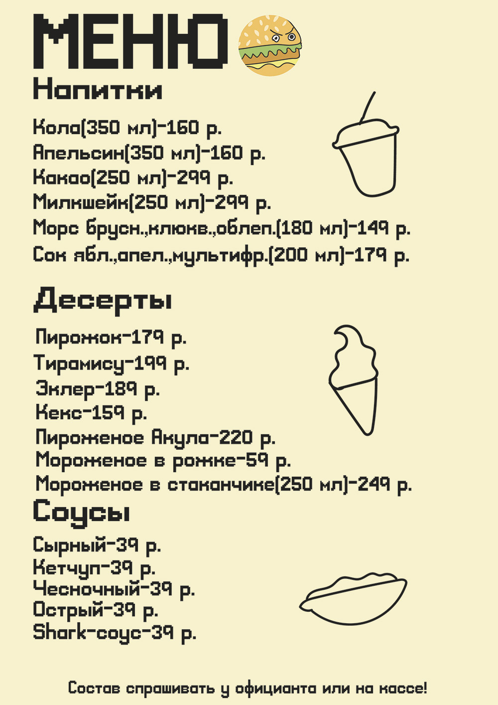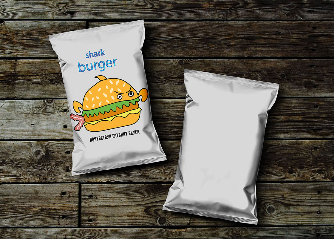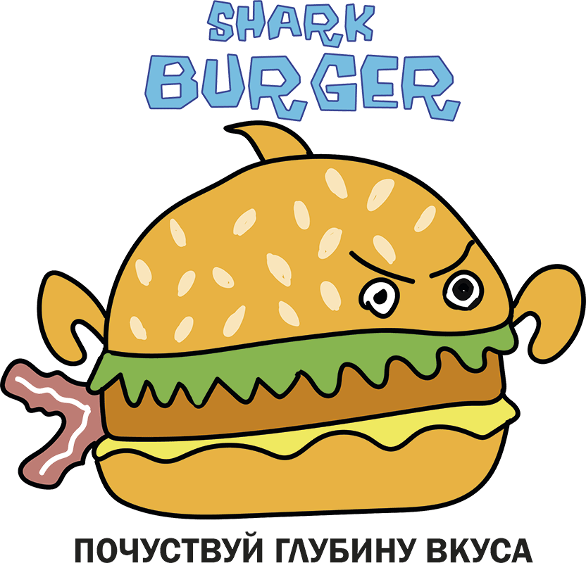 Название "Шарпбургер" рождает мгновенную игру образов, которую Дмитрий блестяще воплотил в жизнь. В центре внимания - уникальный логотип, нарисованный в его неповторимом стиле. Это забавный, но уверенный гибрид акулы и бургера, где острые зубы гармонично соседствуют с сочной котлетой, а хищный взгляд обещает незабываемые вкусовые ощущения. Этот образ сразу задает тон: здесь едят смело, с азартом и без правил.