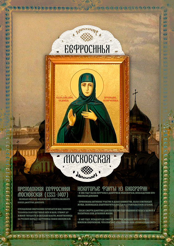 Ефросинья (в миру Евдокия) Московская - образ духовного стержня и покровительницы. Жена Дмитрия Донского, объединившая Москву после разорения, вдохновительница масштабного храмового строительства и символ национального возрождения.