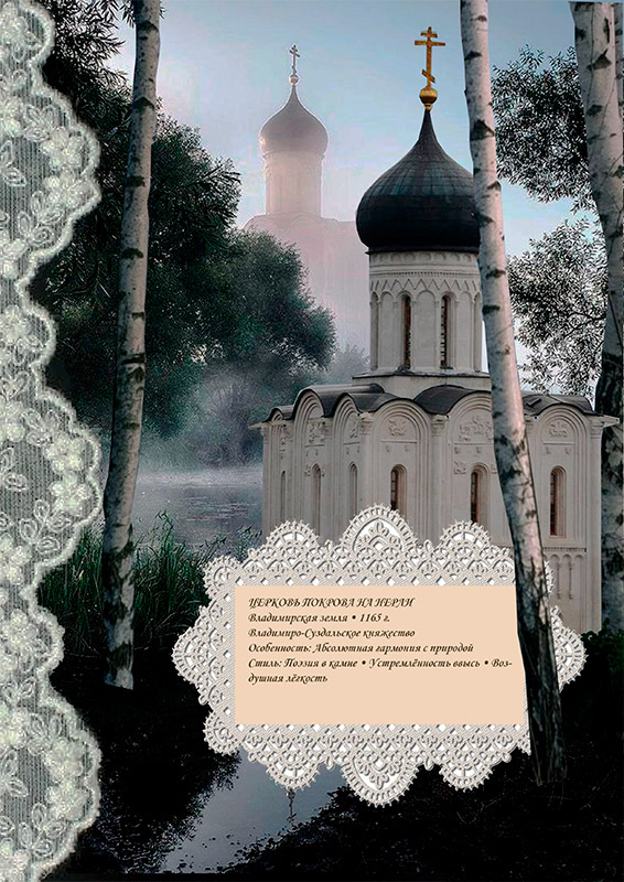 Церковь Покрова на Нерли - Лирическая поэма в камне. Апофеоз гармонии человека, природы и небес. Построенная в память о погибшем княжиче, церковь лишена траурной тяжести. Ее невесомый силуэт, устремленность ввысь и скупая, но изысканная резьба создают образ чистой, светлой печали и идеального согласия с окружающим ландшафтом, став универсальным символом русской духовной красоты.